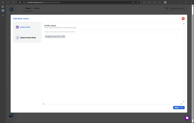 The user will then receive an email invite and a link to sign up, alternatively the user can finish sign up at portal.strongroom.ai/signup