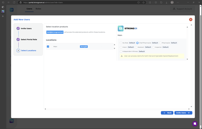 - Select the location/s to provide the user access to and select the user role for StrongER