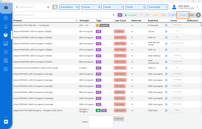- On the stocktake screen, find the filter labeled Active and de-select it. This ensures you can view and count all products, including those currently marked as inactive.