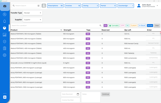 - Using the Product Search box, search for items on the invoice, or scroll to find the medication (if you cannot find the product you are trying to receive on the invoice, try deselecting the "Active" filter)