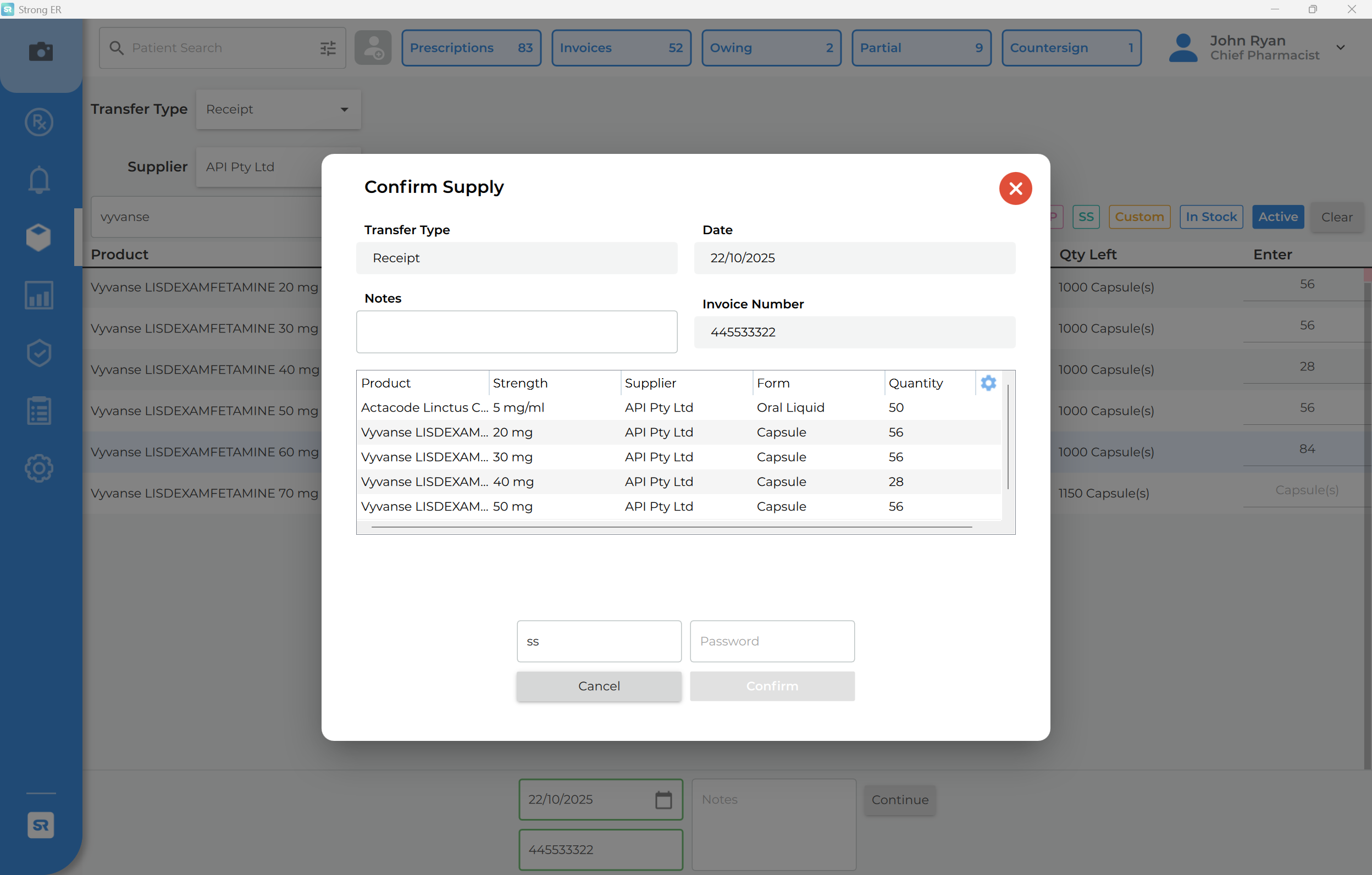 - The Transfer Type defaults to Receipt (use Receipt for receiving stock in on an invoice)